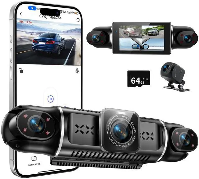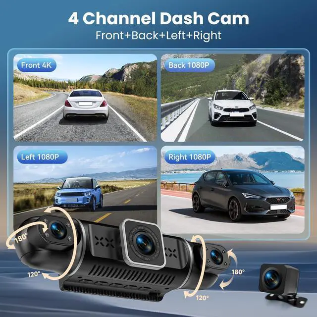 360°View 4 Channel Dash Cam, 4K+1080P Front and Rear Inside Left Right, Dash Camera for Cars, Built-in G-Sensor, IR Night Vision, 24H Parking Mode, 64GB SD Card, Loop Recording, APP Control