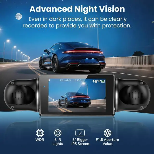 Advanced Night Vision Driving Recorder - This car cameras dash cam has excellent night vision function, ensuring clear and high-quality video recording both day and night. Equipped with a large aperture and multi-layer lenses, the light absorption is increased by 60%, and WDR technology further enhances image quality, ensuring clear video both day and night. Realize 24/7 clear monitoring, providing clear images even in extreme dark environments.