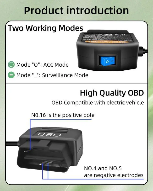 Dual working mode: ACC mode: ["O"], car vibration triggers power supply, OBD line automatically stops power supply after the car is stationary and delayed for 20 minutes, parking monitoring mode: ["I"], tachograph parking mode will be activated for 24-hour monitoring. The car will continue to power supply after the car is stationary. Until the voltage is lower than 11.6V (low voltage), the OBD line will automatically stop power supply after 8 seconds of delay