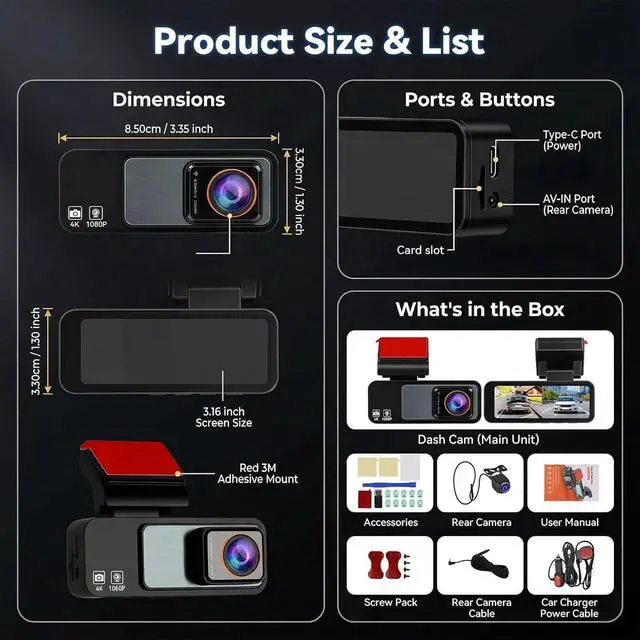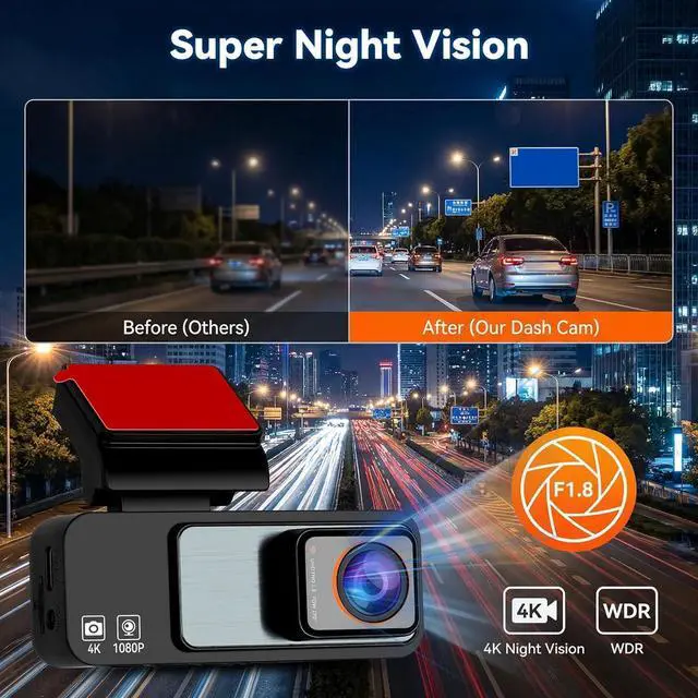 Ultra HD 4K Front + 1080P Rear Recording: The dash cam supports dual-channel simultaneous recording, capturing both front and rear footage, ensuring clear footage of the road ahead and behind. The front camera features a 170° ultra-wide-angle lens, providing full coverage of six-lane roads and capturing more road details with this 4K dash cam