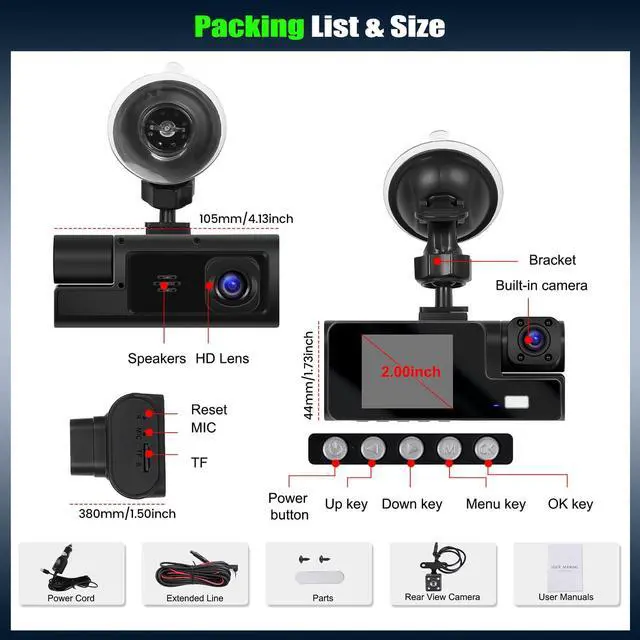 7. Special features: three cameras, exposure compensation, motion detection, loop recording.
