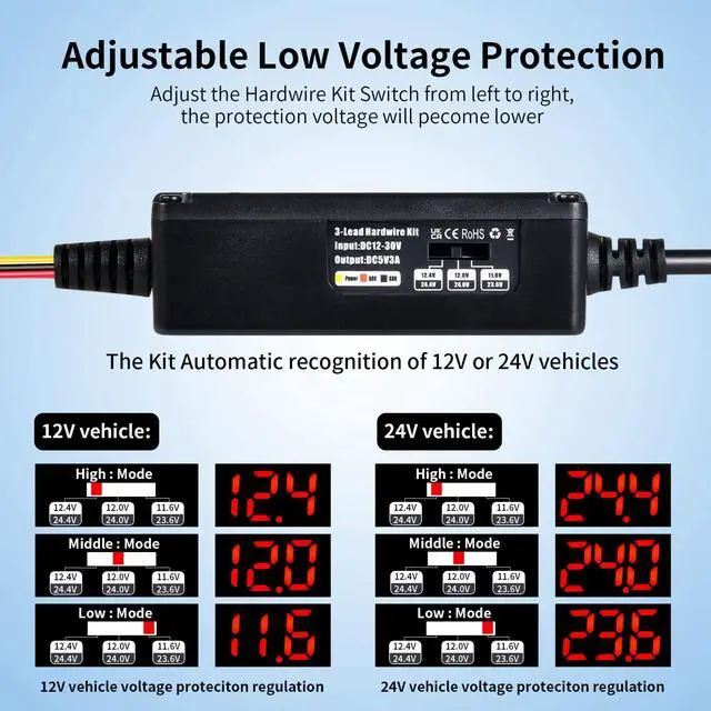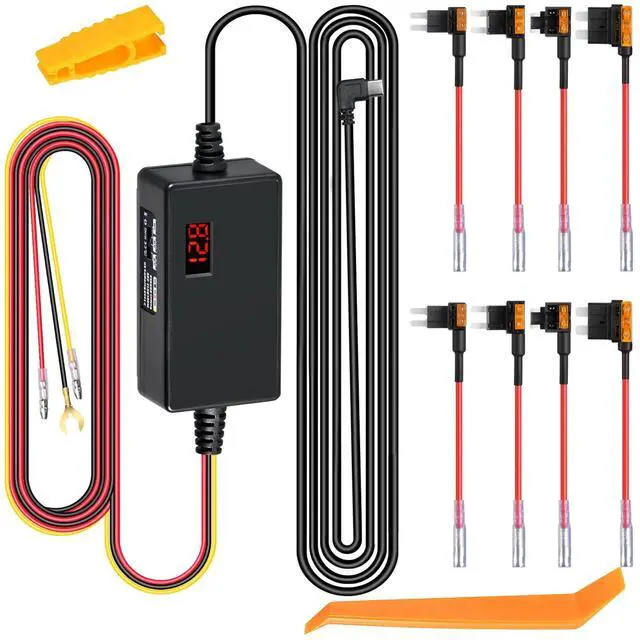Dash Cam Hardwire Kit, 12V-24V to 5V/3A with Voltage Display 24/7 Parking Mode Acc Detection 3-Level Low Voltage Protection ( 11.6V /12V/ 12.4V ) Car Dash Camera Charger Power Cord
