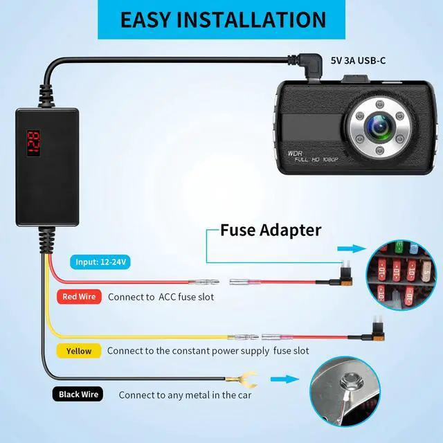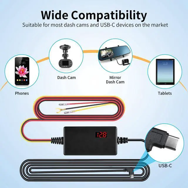 Universal Compatibility: This ACC hard-wiring kit works with all 12V-24V vehiclesfrom sedans and trucks to large commercial vehiclesdelivering continuous power to your USB-C dashcam. ACC Detection: The built-in screen displays real-time battery health. Automatically switches between parking and driving modesno manual setup needed! Withstands engine start-stop current surges for stable, reliable performance.