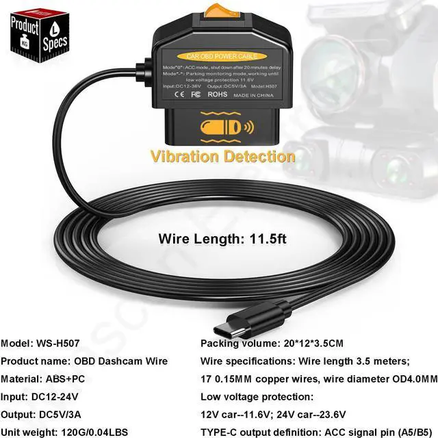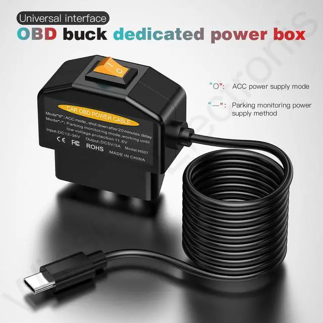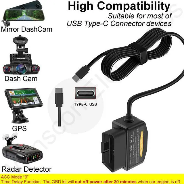 The OBD charger cable is design for majority dash camera, GPS, radar detection and other electronic devices with USB Type-C connector.