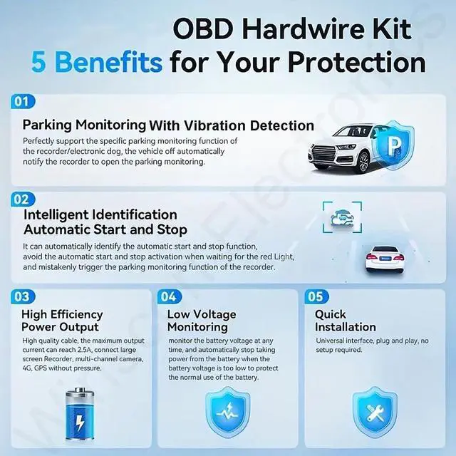- Surveillance mode: When your car ACC is off, the OBD power cable will keep working until detecting the car battery voltage is at 11.6V(low voltage protection).