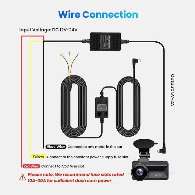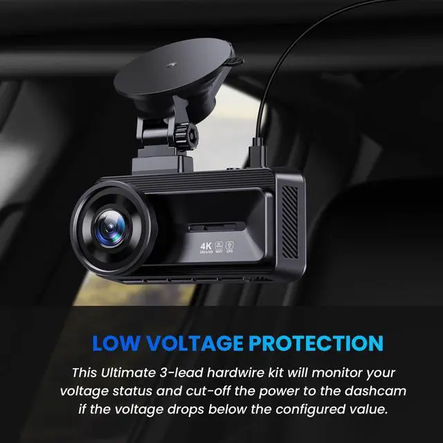 Low Voltage Protection - The car hard-wiring kit connects to the car battery or fuse box power source to provide 24-hour uninterrupted power to the device. If the voltage drops to 11.8V, the voltage will be automatically disconnected to prevent the vehicle from being unable to start due to low battery voltage.