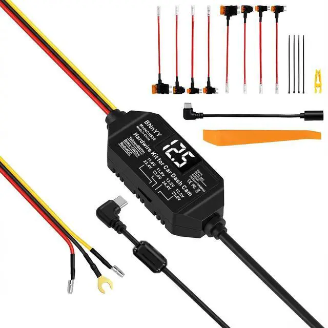 USB C Hardwire Kit for Dash Cam with Low Voltage Protection,Acc Detection,4-Level Adjustable Voltage (11.6V-12.5V)&Digital LED Voltmeter,3-Lead Cable for Dash Camera Parking Mode,Fuse Taps Included