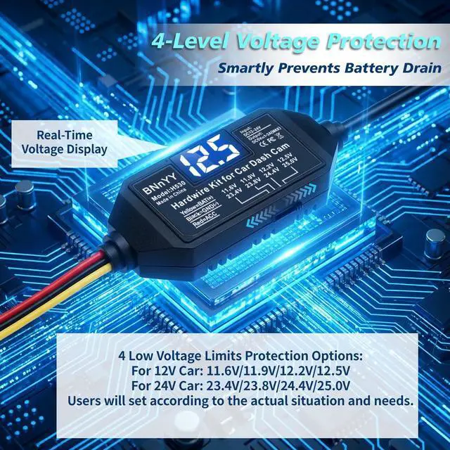 4-Level Adjustable Low Voltage Protection: Protect your car battery from complete drainage with Upgraded 4-Level Adjustable Low Voltage Protection (11.6V/11.9V/12.2V/12.5V) that allows you to set the cutoff voltage for your climate and vehicle. This Adjustable Low Voltage Protection ensures your car starts reliably every time, making it a safe choice for extended parking