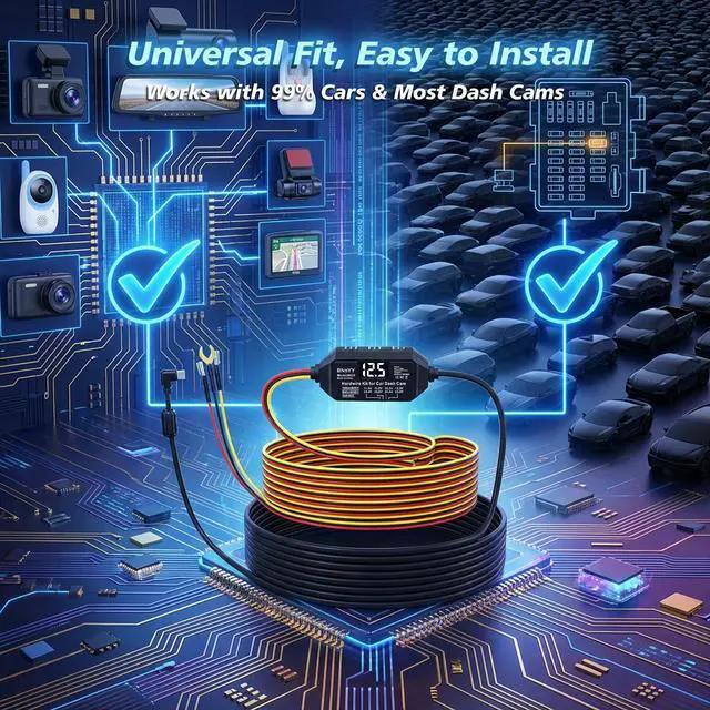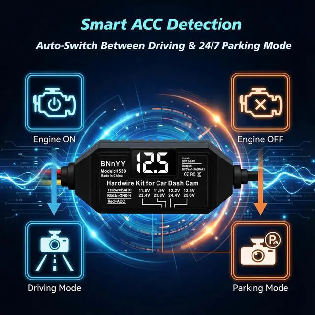 Advanced ACC Detection Technology: Experience seamless transition between driving and parking mode with advanced ACC Detection technology. Our hardwire kit automatically powers your dash cam when the engine starts and switches to parking surveillance when you turn off the ignition. Never miss a critical incident, 24/7, with effortless automatic operation
