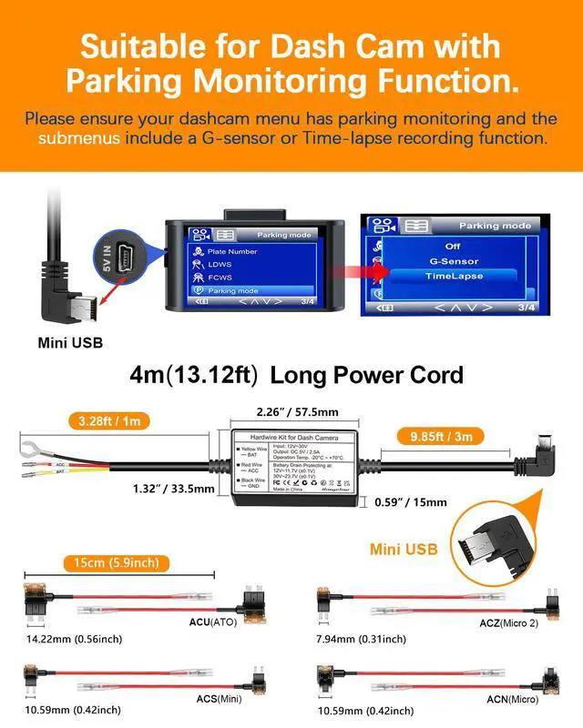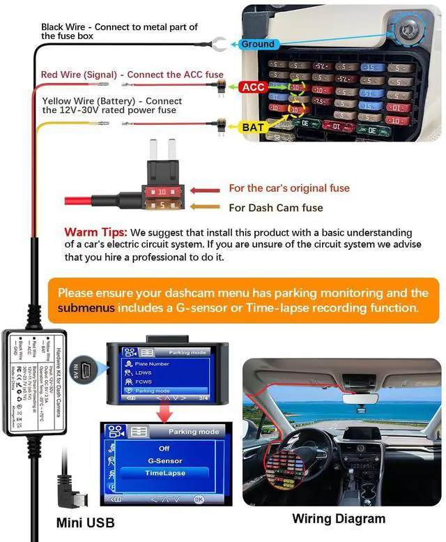 Please make sure your dashcam supports the 3-core (BAT / ACC / Ground) 24-hour Time-Lapse parking mode function on camera settings.