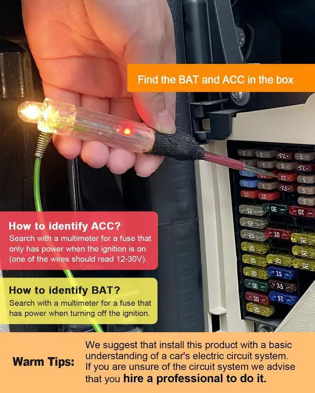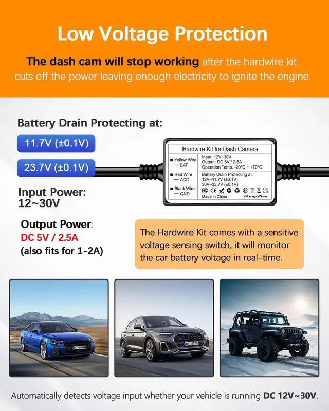 The Hardwire Kit comes with a sensitive voltage sensing switch, it will monitor the car battery voltage in real-time.