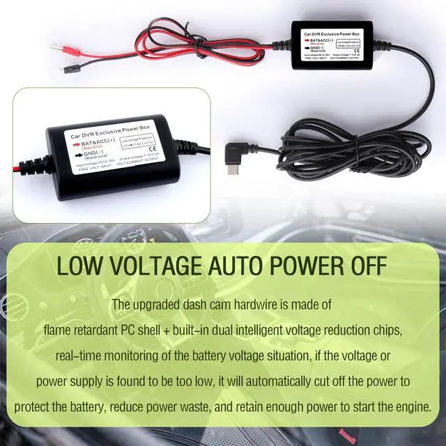 ? The upgraded dash cam hardwire is made of flame retardant PC shell + built-in dual intelligent voltage reduction chips, real-time monitoring of the battery voltage situation, if the voltage or power supply is found to be too low.