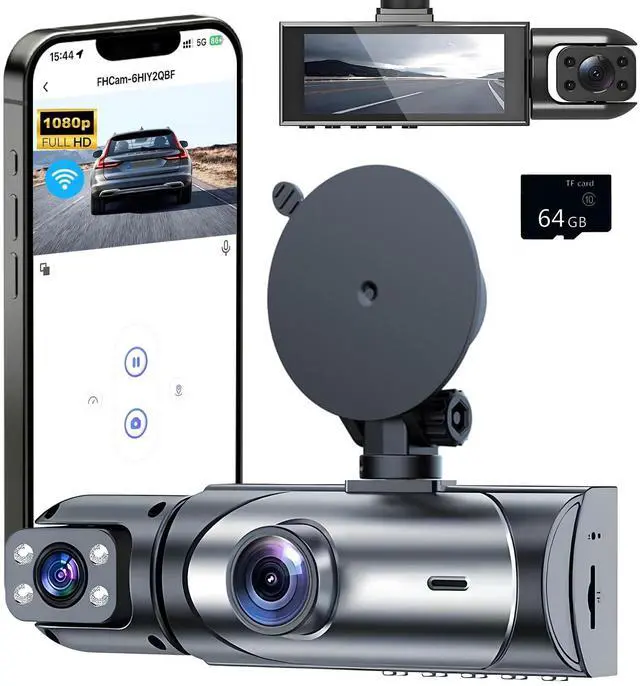 1080P Dash Cam Front Inside, Full HD Dual Dash Cam for Cars, WiFi Dash Camera, 3.16" Screen, Night Vision, G-Sensor, Loop Recording, APP Control, 170°Wide Angle, Include 64GB Card