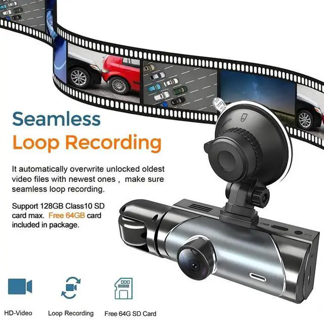 Reliable Loop RecordingThe dash cam supports loop recording, automatically replacing old video files with new ones when storage is nearly full, ensuring continuous recording without interruption.The dash cam comes with a 64GB SD card included, so there's no need for an additional purchase.