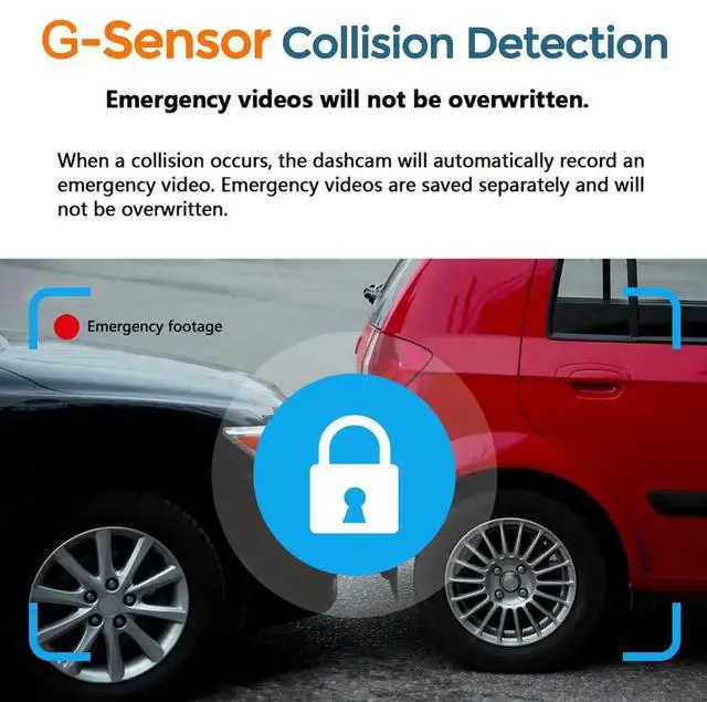 Smart G-sensor LockThe dash cam is equipped with a built-in G-sensor that safeguards important footage in the event of a collision or sudden incident, ensuring that critical recordings are not overwritten or deleted.