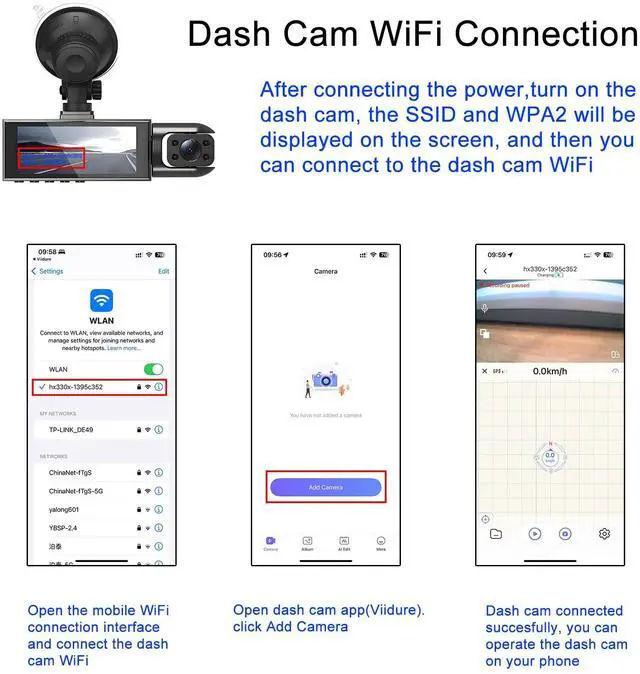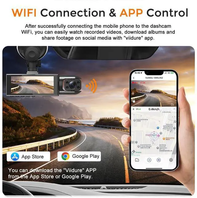 Built-in 5G WiFi and APP ControlThe dash cam features built-in WiFi for seamlessly connecting the dash cam front and rear inside to your smartphone, allowing for immediate use once connected. It supports APP both Android and iOS devices. Through the APP, users can effortlessly preview, download, and manage videos in real-time using the "Viidure" application. Also, you can turn on the GPS function in the app, records the driving route, real-time speed, location, etc.