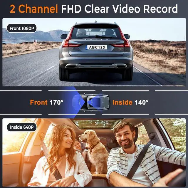 2 Channel Recording Dash CamThe dash cam monitors your cars front, inside in1080P+640P resolution, with a 170° front view, 140° cabin view, the dual dashcam ensures you never miss a moment, perfect choice for daily drivers and family trips, giving you greater peace of mind during your journey.