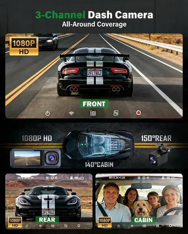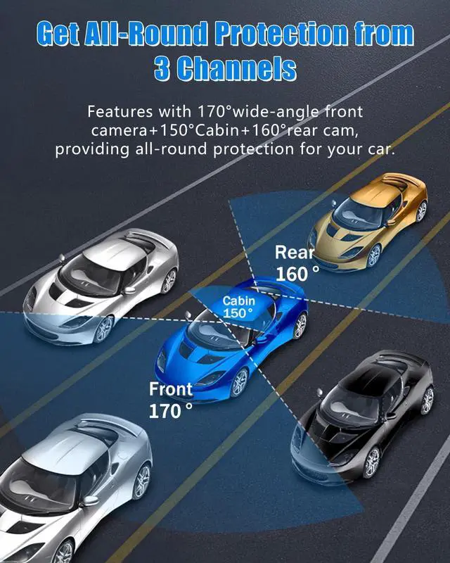 1080P+1080P+1080P3 channel dash cam with a 170° front view, 150° cabin view, and 160° rear view, the triple car dash camera provide cinematic smooth video evidence in case of accident dispute or insurance claims, perfect choice for Uber/Lyft drivers and family trips.