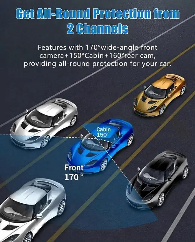 Front 1080P+Inside 1080PDash cam front and inside with a 170° front view,150° cabin view,the car dash camera provide cinematic smooth video evidence in case of accident dispute or insurance claims, perfect choice for Uber/Lyft drivers and family trips.