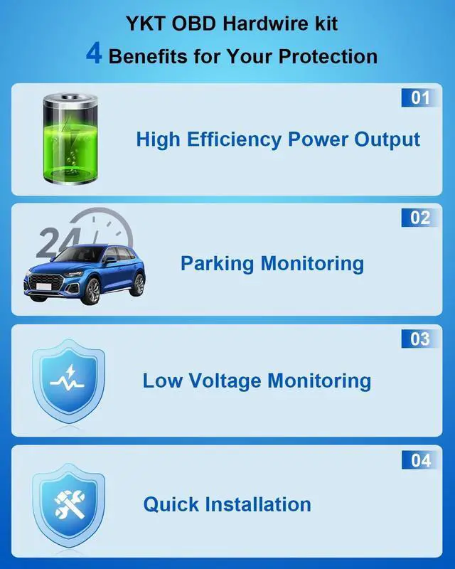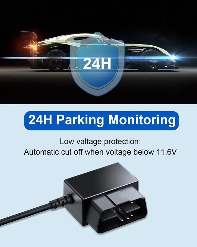 24 Hours Parking Mode (NOTE: Tesla and cars made before 2005 do not match) Makes your dash cam parking monitor work. Keeps it powered even after the engine is turned off, protecting your vehicle at all times. The vehicle of OBD plug is connected to an OBD jack under the vehicle seat can provide uninterrupted power to the dashboard camera for 24 hours. It can provide power even when the car is turned offIt keeps running and cannot be powered off