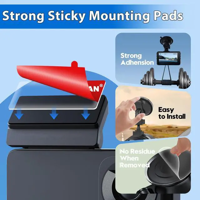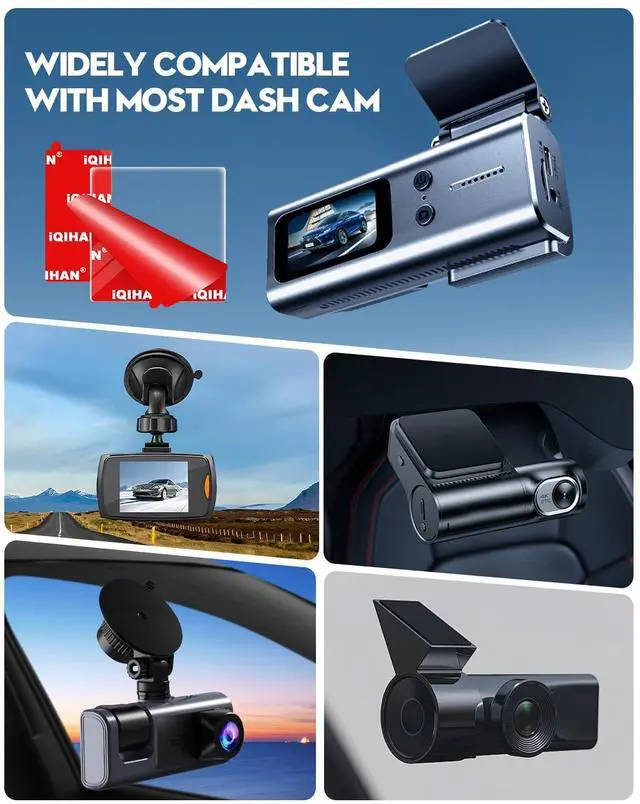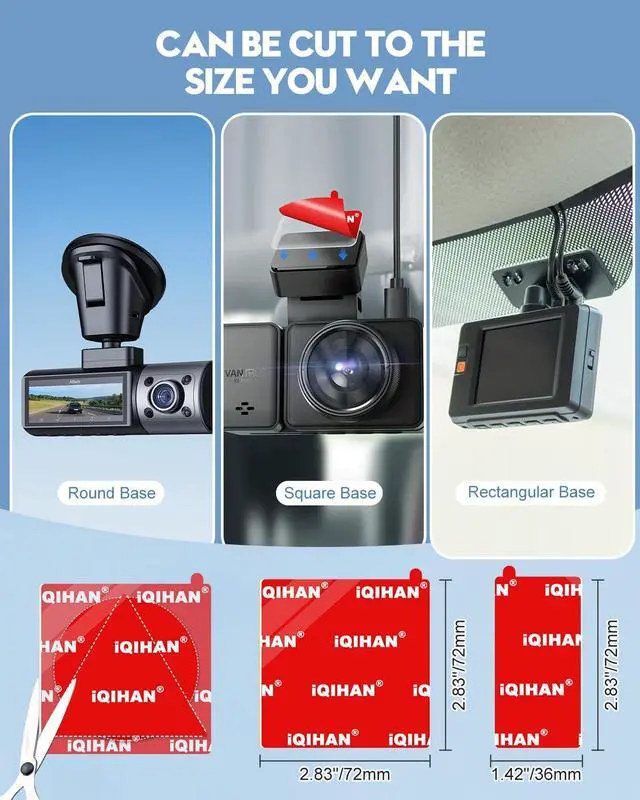 ?Customizable Fit: The double-sided adhesive pads can be easily trimmed to fit different types of dash cam mounts—such as dash cam with square base, dash cam with rectangular base, dash cam with round base, front cameras, front-and-rear setups cameras, inside-view cameras, safety camera, car baby cameras, etc
