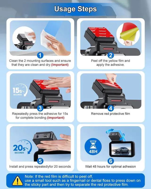 2. It is normal for the red film to be difficult to remove. Please use a small tool (e.g. fingernail and dental floss) to press down on the sticky part before trying to separate the red protective film!