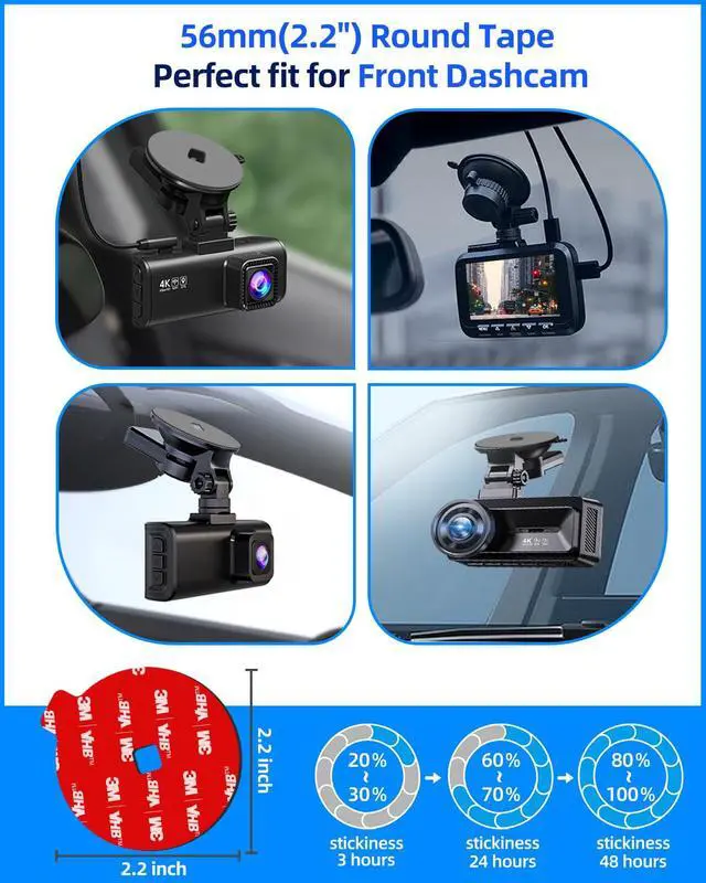 - Perfect Fit for Dash Cam Suction Cup Holder: Our set includes 2 pack round adhesive tape that are designed to perfectly fit your dash cam suction cup mount. With a unique central hole design, these tape maintain the vacuum suction principle of your mount, ensuring a more secure and stable installation without the need for any trimming or adjustment. Simply peel, stick, and press for a hassle-free installation.