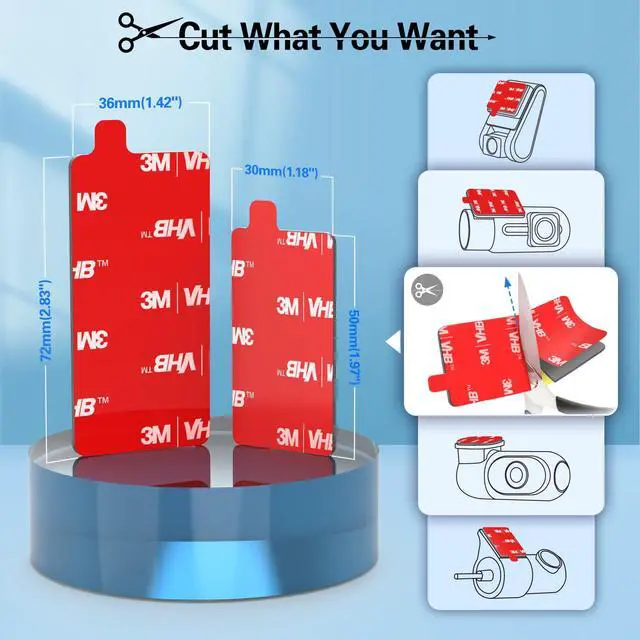 2pcs sticky pads for front dashcam - 36mm×72mm (1.42"×2.83"), 2pcs adhesive pads for rear dash camera - 30mm×50mm (1.18"×1.97")