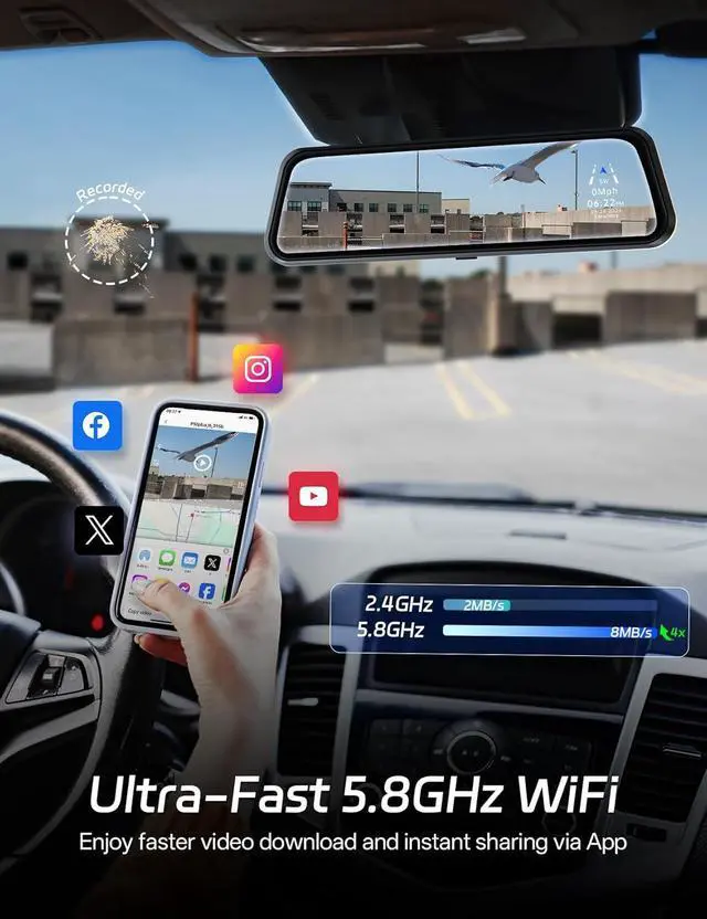 Easier Access to Video: The built-in dual-band WiFi ( 2.4GH z & 5.8GH z) in the smart mirror camera simplifies everything. Enjoy faster, more stable connections for seamless video transfersno need to remove the SD card. Simply connect your phone to the dash cam via high-speed 5.8GH z WiFi to instantly download critical clips or share your favorite moments on social media.