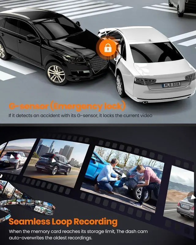 Emergency Lock & Loop RecordingThe camera for car recording front and back, when the memory card reaches its storage limit, the car dash camera will continue recording with this Loop recording feature. If the G-sensor detects a sudden collision, it locks and saves the current video. This locked video can serve as evidence and won' t be overwritten.