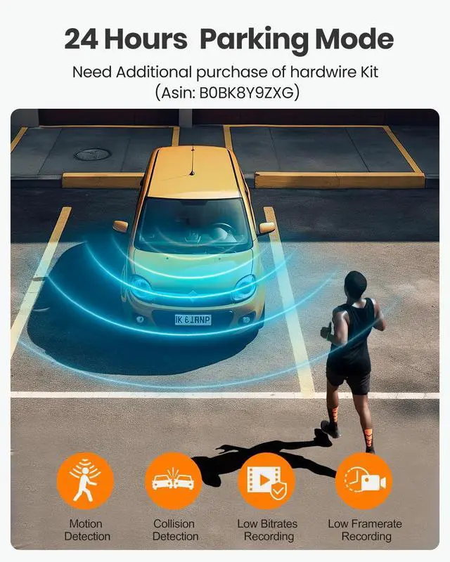 4 Parking Modes for 24/7 Recording Protection1. Collision Detection Mode 2. Motion Detection Mode 3. Low Framerate Recording Mode 4. Low Bitrate Recording Mode. Choose the parking mode according to different parking situations. To use 24 hours parking monitor mode, need