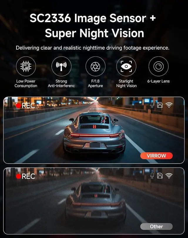 [Car Camera Front and Rear with Night Vision] - Crystal-Clear Front/Rear Videos with SC2336 Sensor & WDR Tech! See clearly when others can' t! The F 1.8 aperture + 6-layer lens system maximizes light intake for razor-sharp driving videos. No more blurry night recordingsevery license plate and road detail stays high-HD visible. Automatically adapts to low-light conditions, ensuring critical evidence is always recorded.