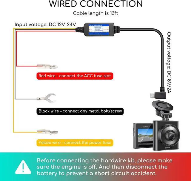 CLEAN INSTALLATION - Up to 13ft of the dash cam hardware kit will meet the needs of most of vehicles and you can connect the dash cam wiring kit to your car' s fuse box and hiding all the cables neately. 5V/2A steady output
