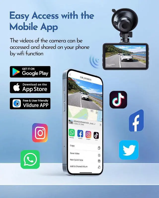 Effortless WiFi & Smart APP Control: You just need to connect the dash cam to your smartphone APP via WiFi and then you can use the app to view, playback, and manage the dash cam on your IOS or Android devices. You can even download the video and share it with your friends and family, or upload it to social media.