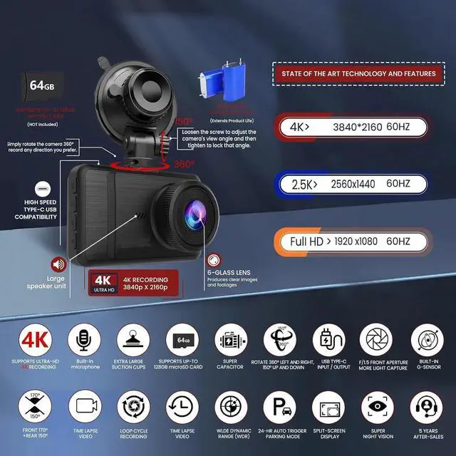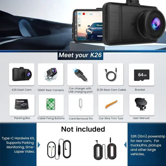 What you get1* 3.3 -inch dash CAM host with a 4K front camera1*6-meter-long 2.5 k rear camera1* 2.5A dedicated Car charger1* set of windshield suction cup 1*free 64G memory card for gift