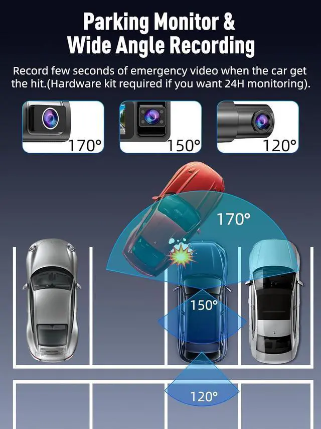 Advanced Night Vision & Parking Monitor- This dash cam utilizes WDR (Wide Dynamic Range) technology to intelligently balance exposure between highlights and shadows. The interior facing car dash cam has 4 infrared LEDs which delivers clear night captures. When parked, the collision-sensitive monitoring system activates upon detecting impact/vibration, automatically triggering a emergency video. Please note that a hardware kit (Not Included) is needed if want 24H to monitor.