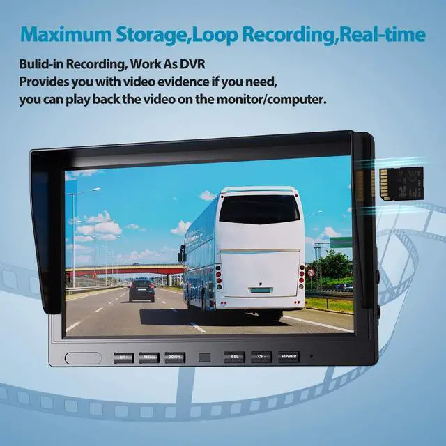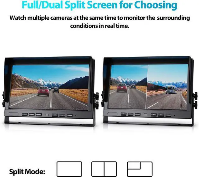 Larger 10 inch Split Screen MonitorOur 10-inch HD monitor features with Dual Split Screen, allows you see two cameras at the same time and provides more details, larger than the common 7-inch/9-inch screen on the market. It is more suitable for the large vehicles as: 5th Wheel Trailer/Tractor/RV/Truck/Bus/Semi-Trailer/Box Truck, etc.