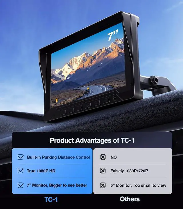 1080P HD Backup CameraTC-1 back up camera for cars adopts 1080P full HD reversing camera with 170 degree wide angle, with 7-inch monitor display, with radar collision warning alerts, making it easier for you to spot pedestrians, cyclists and obstacles when you are backing up.