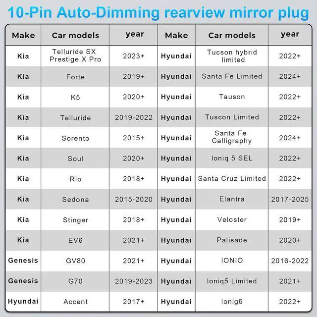 Important: Verify Compatibility Before OrderingThis product is designed for Hyundai and Kia models equipped with an Auto-Dimming Rearview Mirror. Before purchasing, please confirm that your vehicle has a 10-pin connector in the middle of the rearview mirror bracket as shown in the product image.