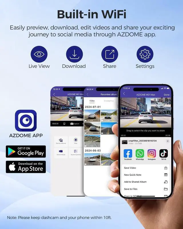 Convenient App Control: M01 Max 4K dashcam for car is built in Wi-Fi, enables you easily manage settings and view, download, playback and share videos via the dedicated AZDOME app.