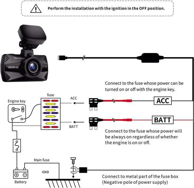 Two Working Modes with 4 FusesYEECORE dash cam hardwire kit with Mini, ACS, ATO, Micro2 adds circuit fuse holders for 24-hour park monitoring mode or regular ACC mode. Vehicle hardwire kit connects directly to the car battery or fuse box power supply, permanently connected for continuous power supply without taking up the car cigarette lighter.