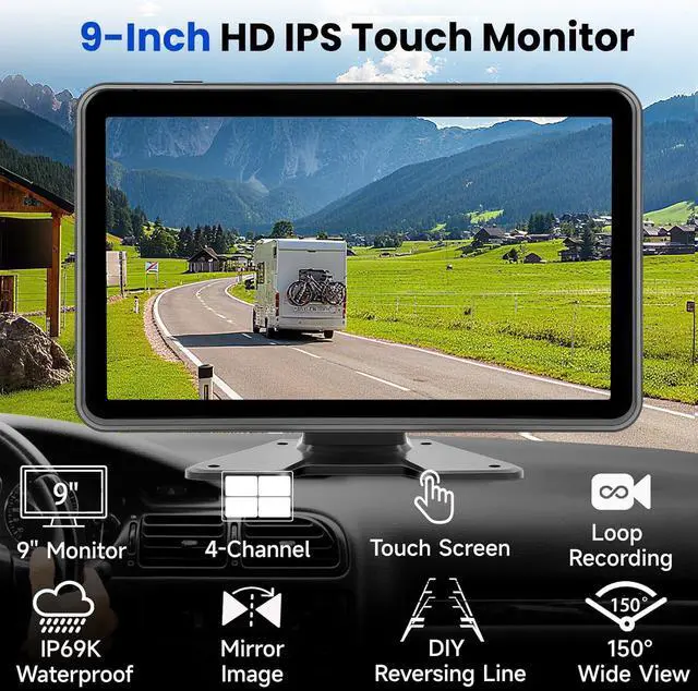 9" HD IPS Full Touch MonitorThis is a wired camera system, which requires cable installation for power supply. It is not a wireless, magnetic, or solar-powered system. The Anti-Glare screen adopts an IPS panel that maximizes the color of the image, ensuring that you can see clear image quality from all angles. Compared with traditional screen, our IPS screen has both brightness and color presentation. It is an ideal choice for highway driving, or navigating narrow RV campsites.