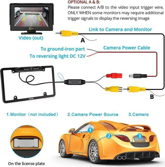 CVBS Screen & Accurate ColorThe license plate backup camera is designed to eliminate blind spots and avoid obstacles when reversing. Built-in clear color CMOS image sensor helps to provide the driver with clear pictures and eliminate all blind spots behind the car.