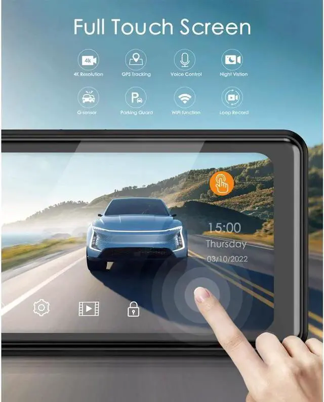 This mirror dash cam also with voice control function to release your hand from frequent operation between the dash cam and driving. 10 voice commands: Turn ON/OFF screen, audio, show front/rear/both camera, video start, take photo, lock the video.