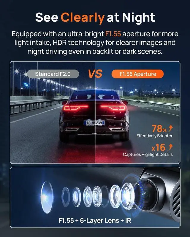 Super Night Vision Function& 7-Glass/F 1.55 Aperture LensThe A800SE car dash cam uses 7 layers of high quality glass lenses with F 1.55 aperture and Dual HDR that process frames faster to deliver images with better clarity and vividness, the camera minimizes image noise. It detects sudden changes in brightness, and automatically adjusts brightness for clear recording. The dash cam that can be used with confidence at any time of the day or in certain weather conditions