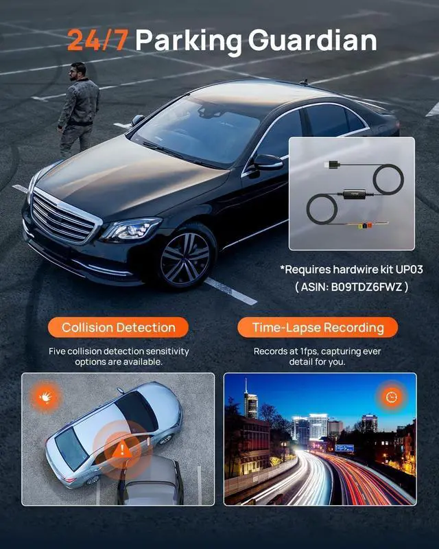 24-Hour Parking SurveillanceKeep monitoring when you leave your car, the G-sensor automatically detects sudden shakes or collisions and starts recording, providing critical evidence for every important moment for 24h. In the event of an accident, you' ll receive a notification to check the event footage in the 70mai app. 70mai Hardwire Kit UP03 (B09TDZ6FWZ, not included) is required for parking mode