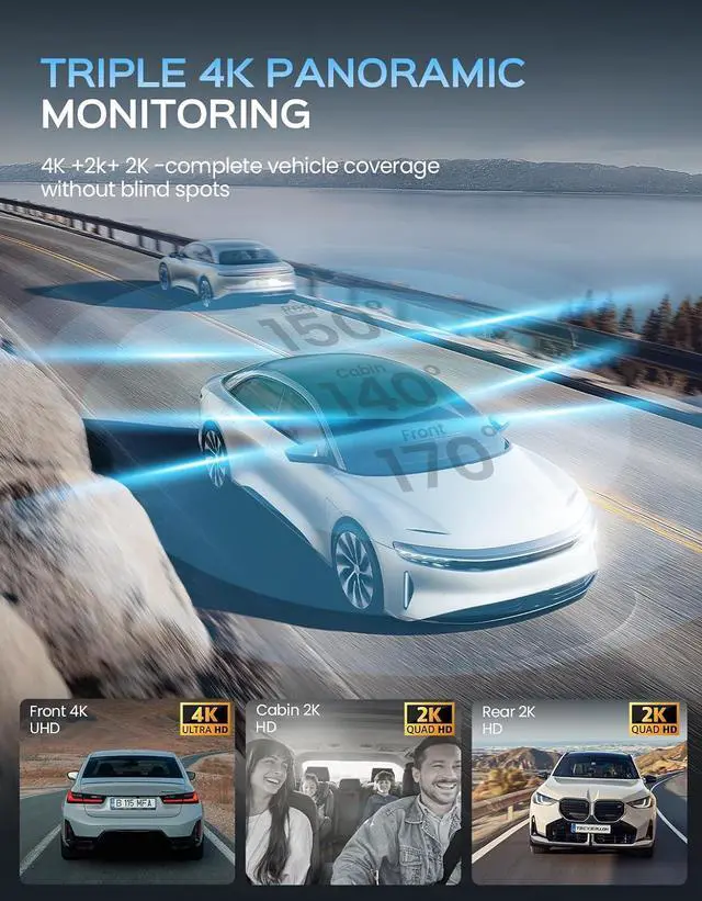 True 4K Triple Dash Cam | Seamless 360° CoverageCapture every angle with a powerful triple camera setup: 4K front + 2K rear + 1080P interior. Enjoy a panoramic 170° front view, 150° rear, and 140° inside helping to reduce blind spots and enhance overall safety. Great for rideshare drivers, family trips, or daily driving.