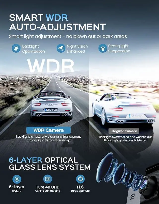 WDR Enhanced Imaging | Clear & Distortion-ReducedThe upgraded 6-layer HD glass lens works together with advanced WDR (Wide Dynamic Range) technology to intelligently balance bright and dark areas for improved image clarity in any lighting. Higher light transmittance (up to 60%) delivers more natural, sharp detail with reduced distortion.