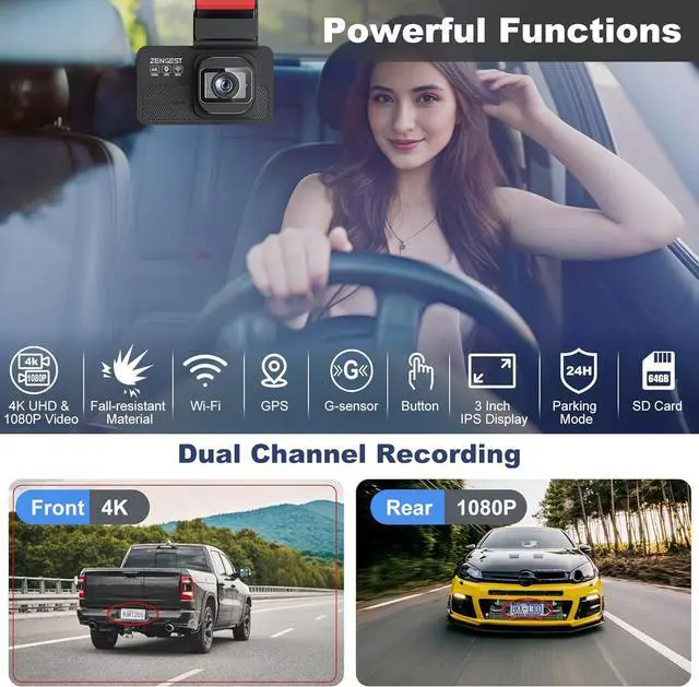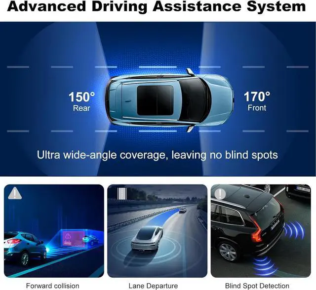 4K + 1080P Dual Dash CamOur front and rear dash cam can simultaneously record Ultra HD 4K (3840*2160P) front video + FHD 1080P rear video, which can help you read key details such as road signs and license plates more clearly, bringing you better driving pleasure and higher safety. To reduce blind spots, it is also equipped with a 170° front cam and a 150° rear cam that captures both the front and rear view of your vehicle, helping you to present evidence during accidents such as collisions.