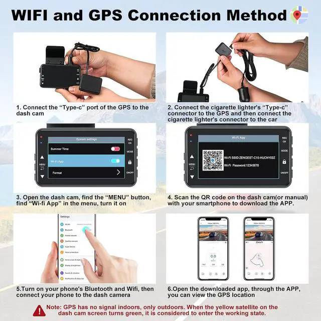 GPS FunctionZengest dash cam with GPS function, you can connect the dash cam to the smartphone APP through the built-in Wi-Fi of the dashboard camera, then you can use the APP to view the GPS location on your phone, and the GPS can record the vehicle' s track, speed and location, you can view your trip in the app. (Note: GPS location can not be viewed on the dash camera, only on the APP on the phone)